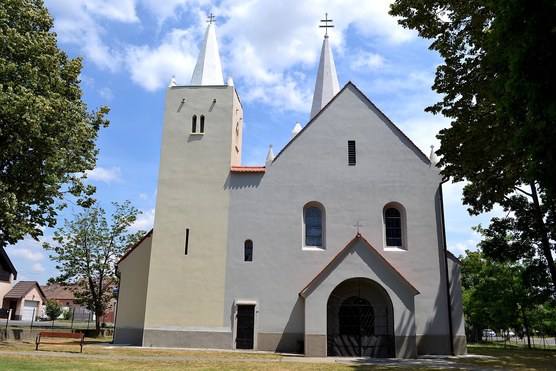Kostol bol pôvodne zasvätený sv. Tomášovi. Presbytérium starého kostola s rovným uzáverom mohlo byť pôvodnou kaplnkou z 13. storočia, ktorá bola na prelome 13. a 14. storočia rozšírená loďou a predstavanou vežou v ranogotickom slohu s viacerými ešte románskymi architektonickými prvkami. Po oboch stranách oltára sú pristavované kamenné cibória. Tento architektonický prvok sa na Slovensku vyskytuje veľmi zriedkavo. Stavba je listinne doložená v r. 1315. Staršia časť kostola (malá veža a loď) je postavená na najstaršom (pôvodnom) kostole z 11. storočia. Kostol bol opravovaný potom v 2. polovici 16. storočia. Ale turecké výboje ho značne poškodili, preto bola stavba v r. 1762 opravená, no zemetrasenie v r. 1764 kostol opäť poškodilo. Ďalšia oprava sa uskutočnila v 1. polovici 19. storočia. Na začiatku 20. storočia bol kostol rozšírený v neorománskom slohu tak, že stará stavba tvorí bočnú loď nového kostola na severnej strane a staré presbytérium sa stalo sakristiou. Nový kostol bol konsekrovaný 25. 9. 1910.