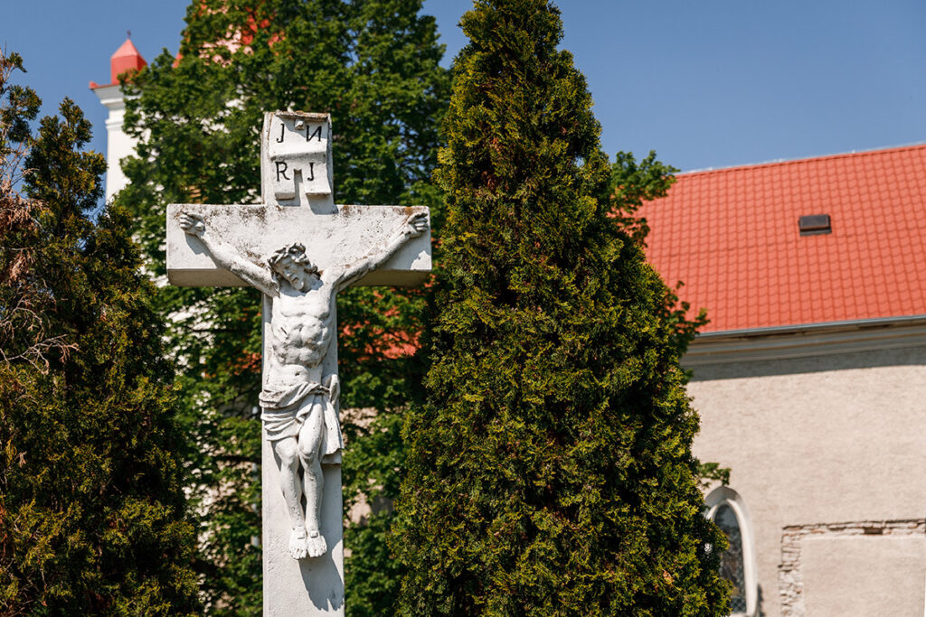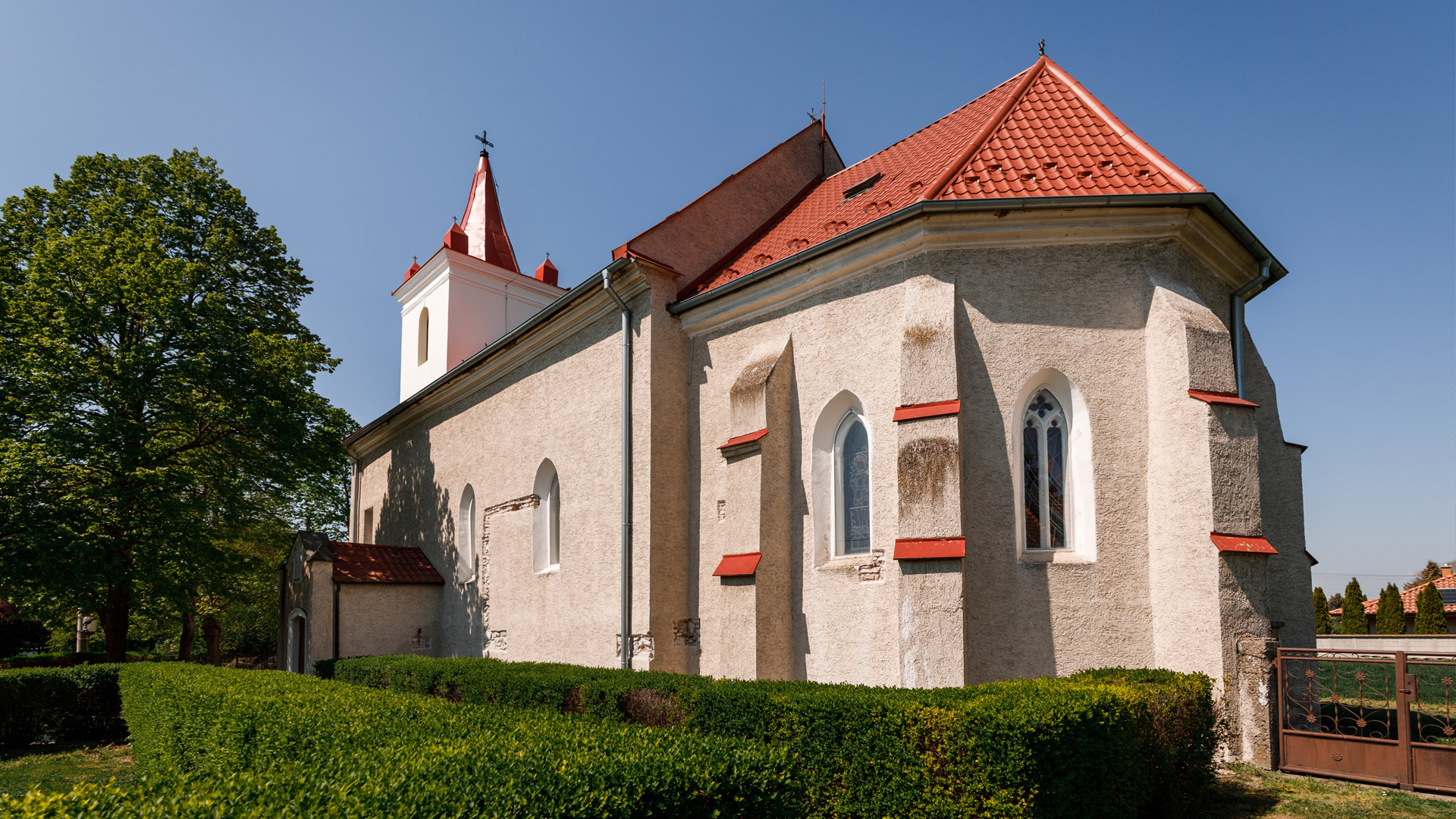 The nave is covered with a Prussian vault (1787), while the sacristy and the polygonal apse have Gothic cross vaulting. On the presbytery’s Gospel side, there is a Gothic pastophorium, and on the opposite side are Gothic niches with seating. The main altar of St. Michael dates from around 1790 in late Baroque style. The side altar – the Baptism of Jesus – is from the second half of the 19th century.