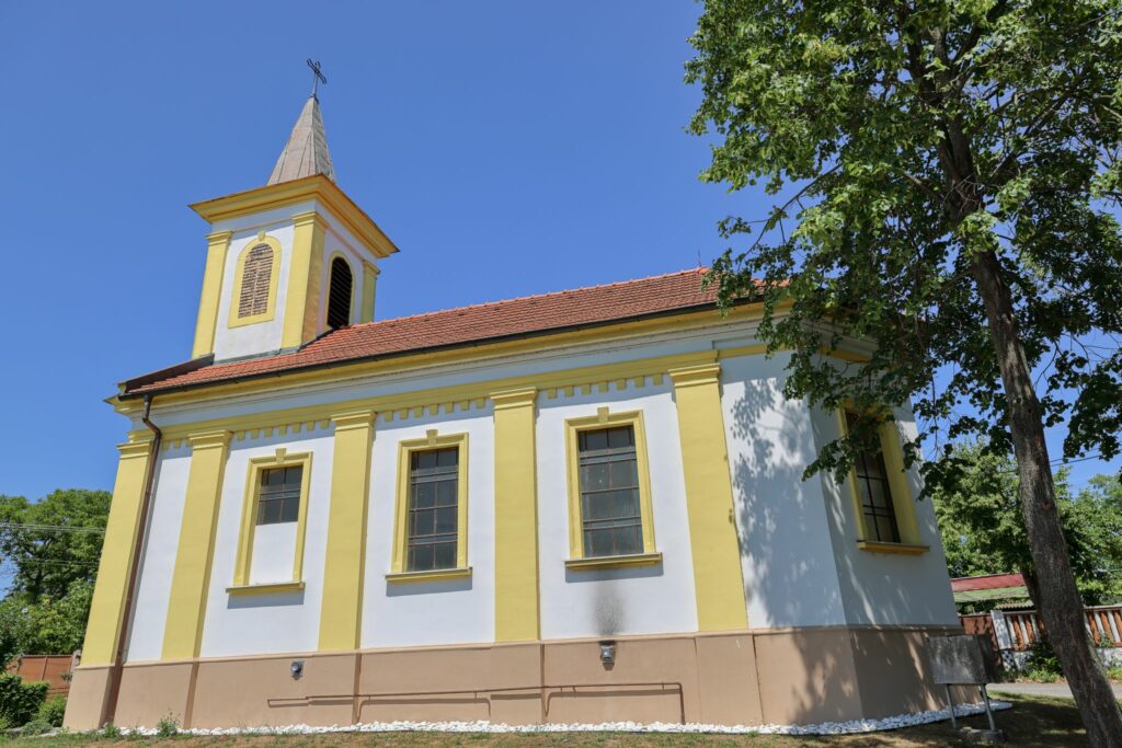 The interior is covered with Prussian vaults. The façades are articulated by windows with profiled surrounds and keystones, pilasters, and a cornice with dentil molding. The tower rises from the front façade in the form of a projecting risalit. It is divided by pilasters and topped with a pyramidal spire. Above the portal, an inscription indicates the year of the chapel’s construction.