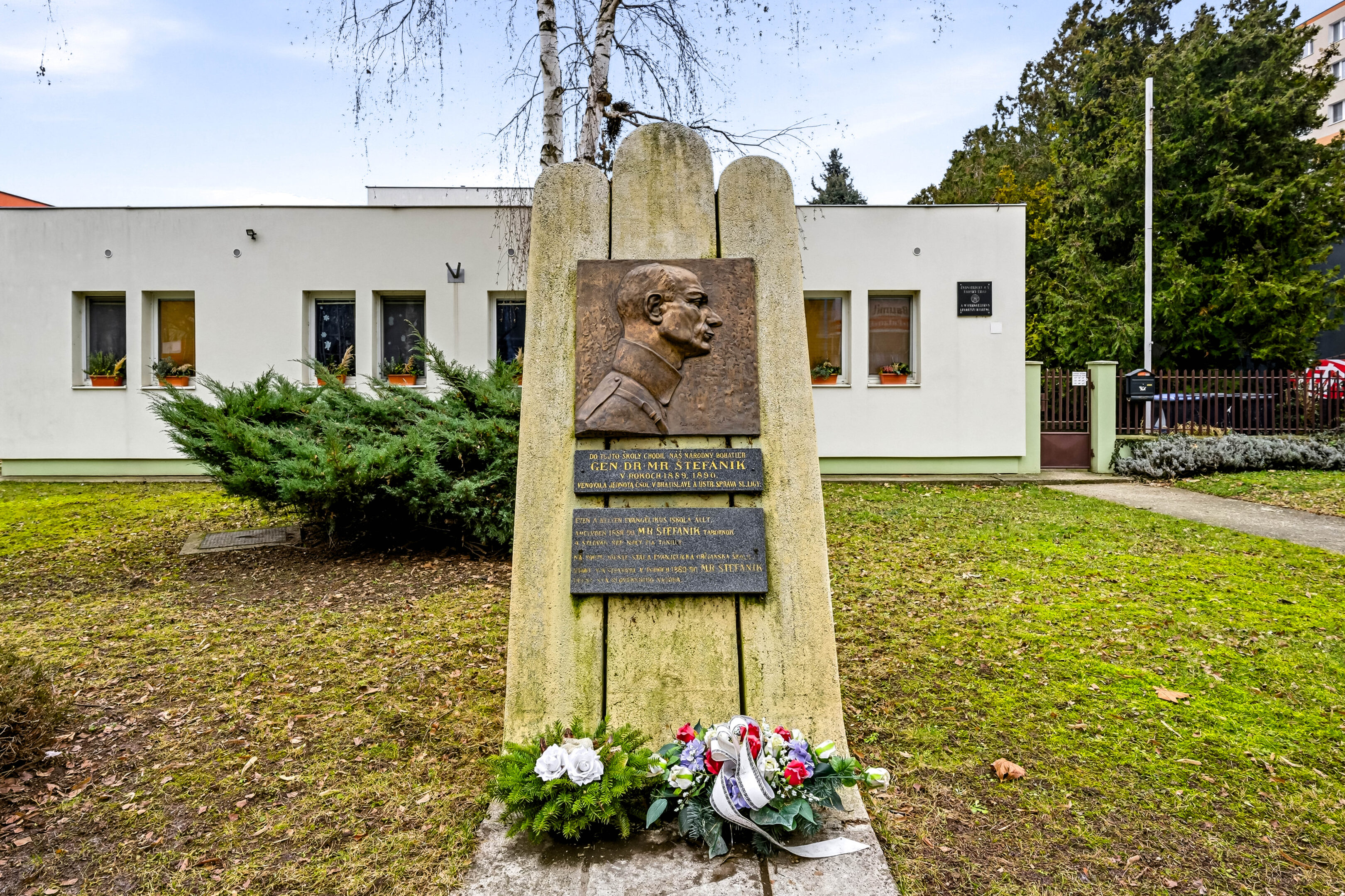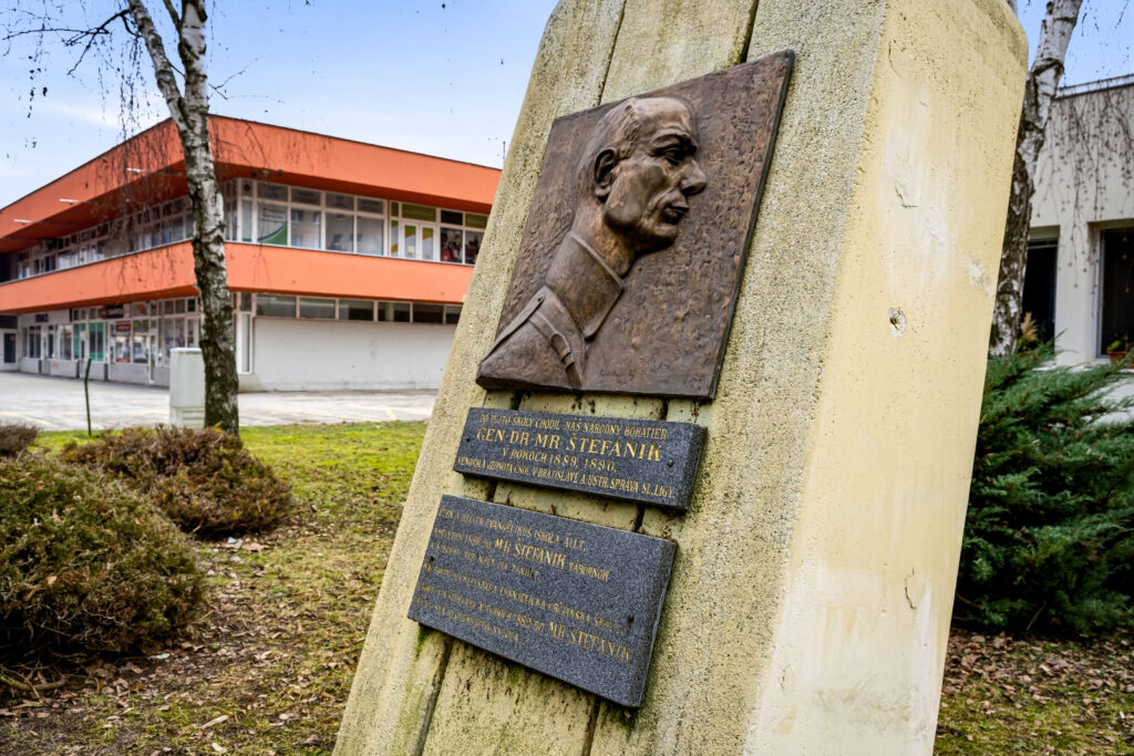 The monument to Milan Rastislav Štefánik in Šamorín is located on Gazdovský rad, in front of the Evangelical church. The site holds symbolic significance—it commemorates that Štefánik studied here between 1889 and 1890. The monument was restored by the city in 2019 and serves as a site for memorial ceremonies honoring the tragic death of the general and statesman.