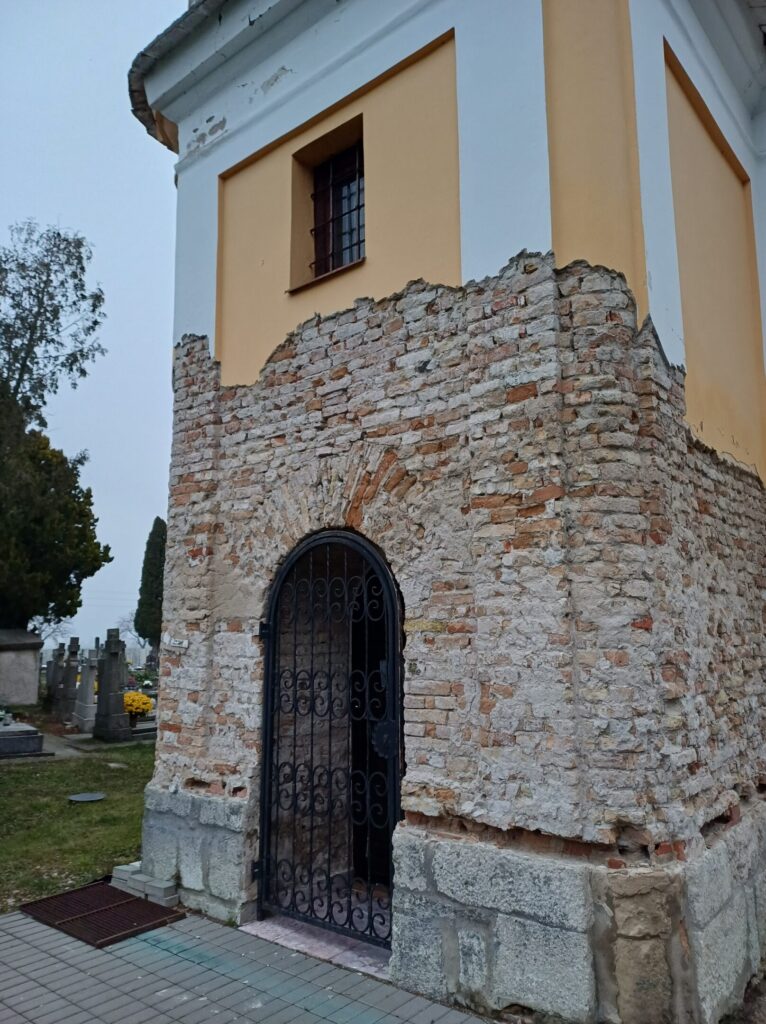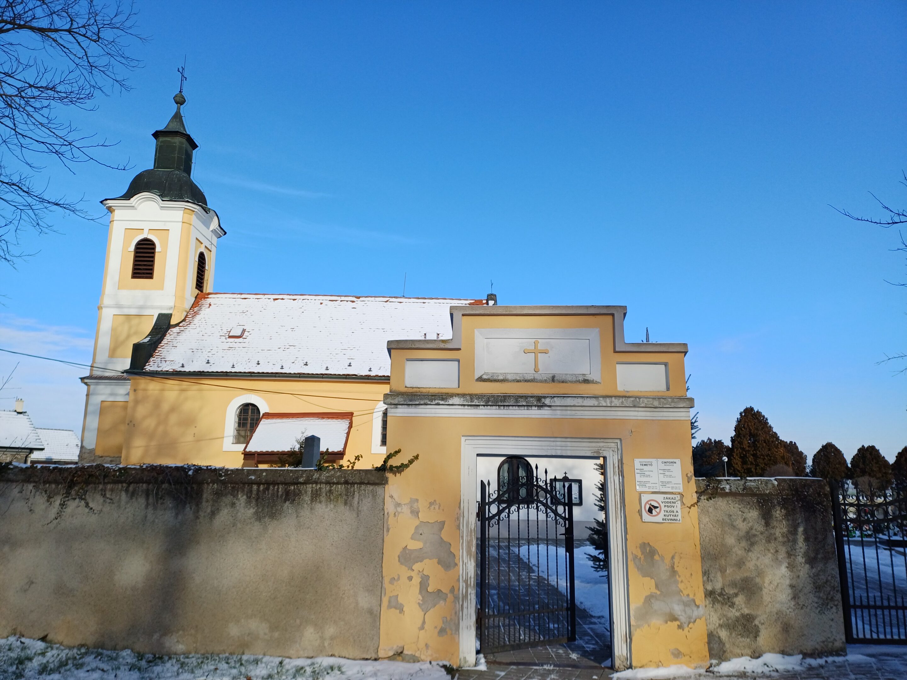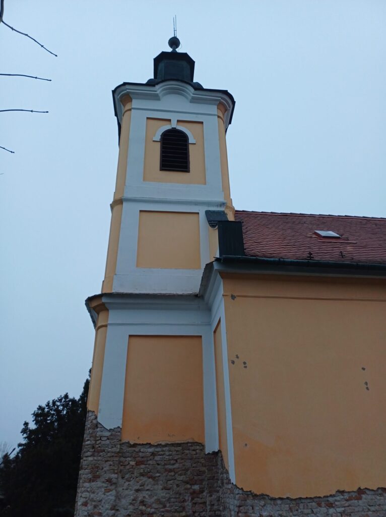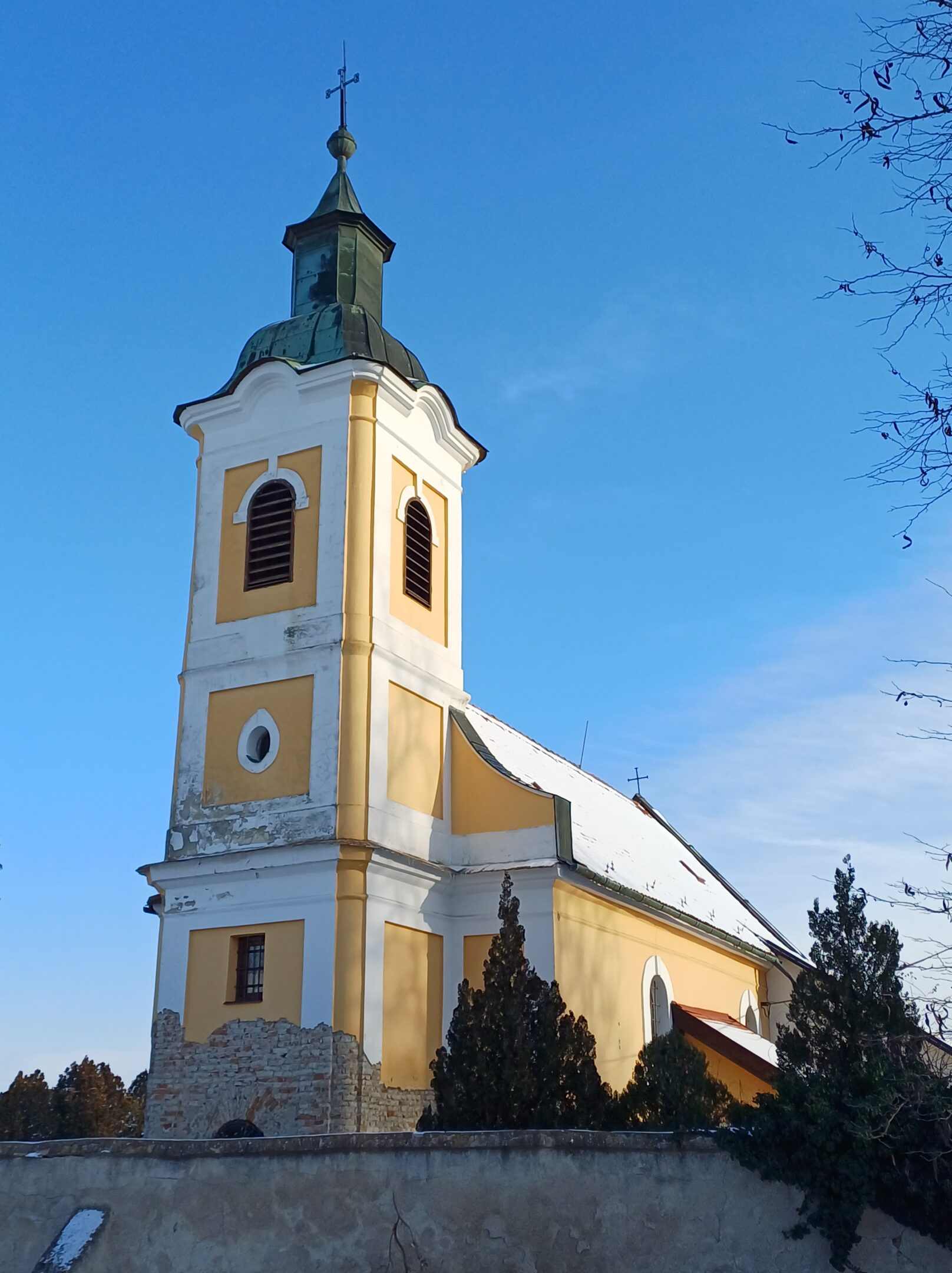 The Roman Catholic Church of St. Andrew the Apostle is a single-nave Romanesque structure with a horseshoe-shaped apse and an integrated tower, dating back to approximately the mid-13th century. It underwent Gothic modifications at the end of the 15th century, from which a Gothic pastophorium (tabernacle) has been preserved. In the 18th century, the church was renovated in the Baroque style, during which the tower and a sacristy were added. A second sacristy was added on the opposite side of the apse in the 19th century. The interior features a Romanesque stone baptismal font, a Gothic pastophorium with its original grille, and an epitaph of the estate owner Šárkány from 1565 located in the base of the tower. Among the architectural details, a tympanum with a cross motif and palmette ornament from the original Romanesque portal has survived. The church facades are divided by semi-circular windows with framed surrounds, featuring keystones in the nave. The tower with rounded corners is articulated by pilaster strips and topped with a crowning cornice with a clock disc and a bell-shaped helm with a lantern.