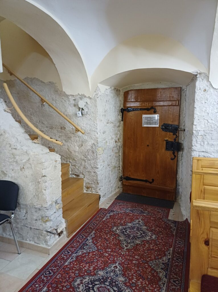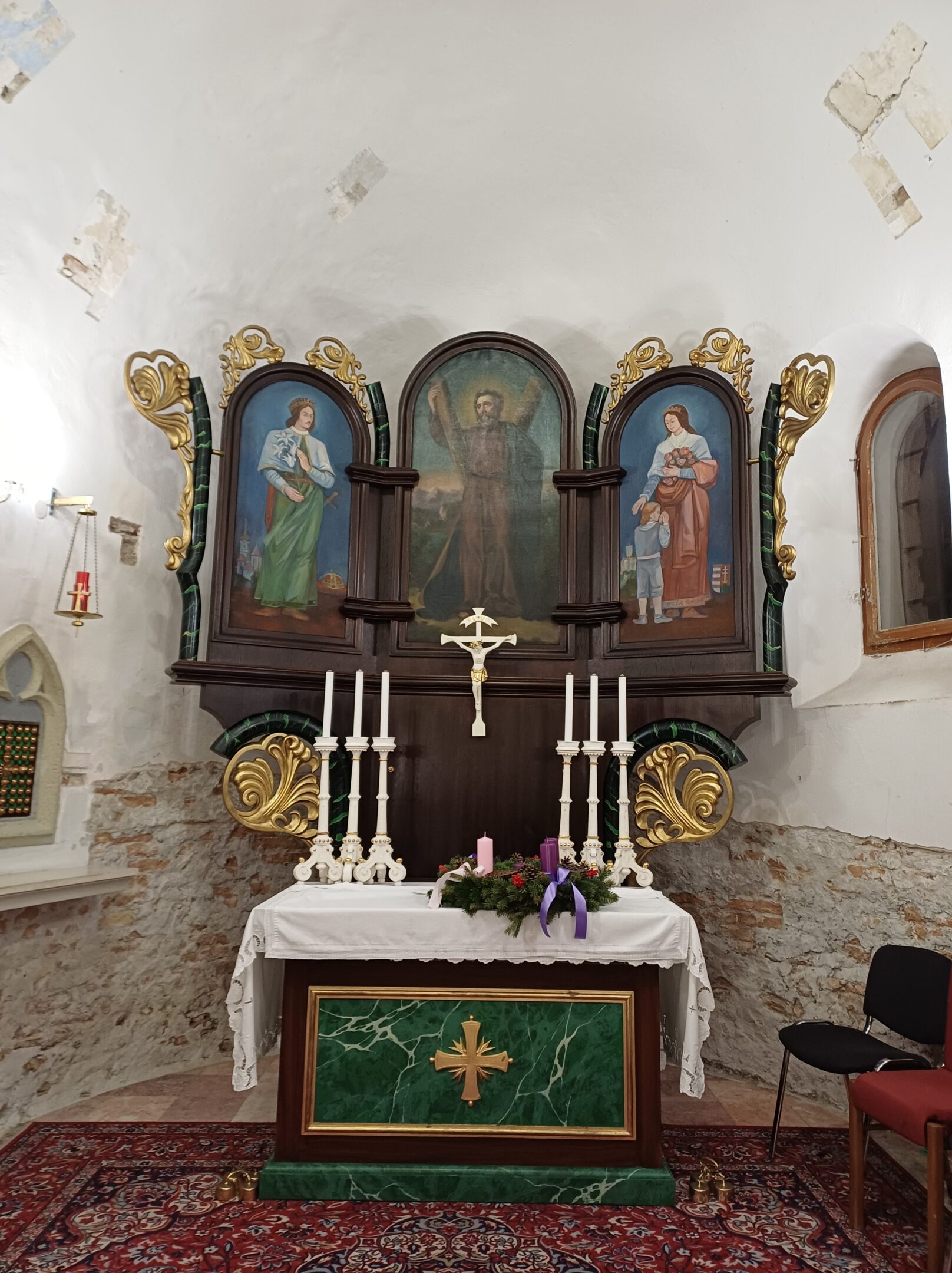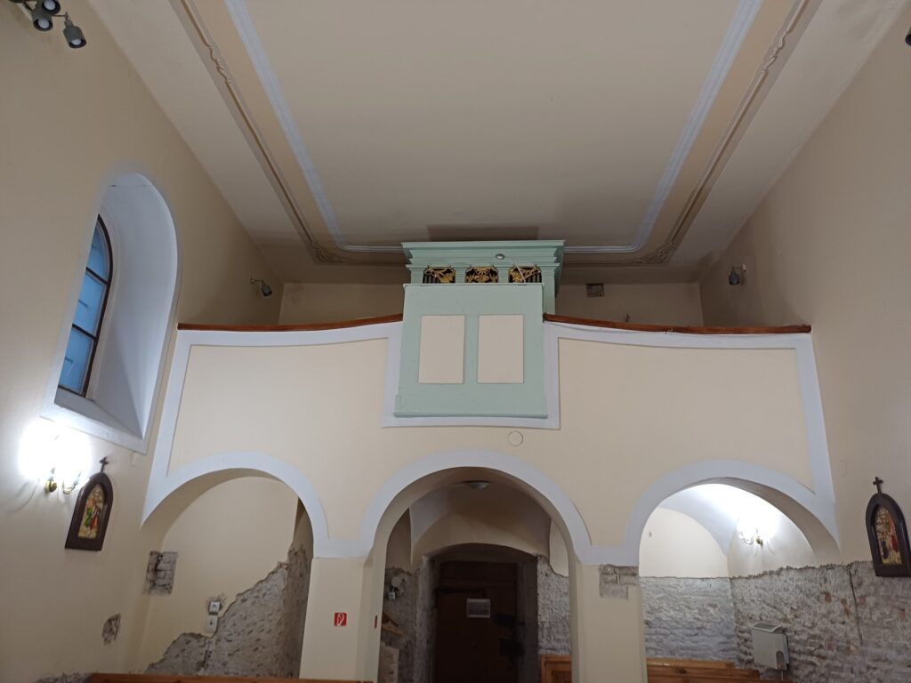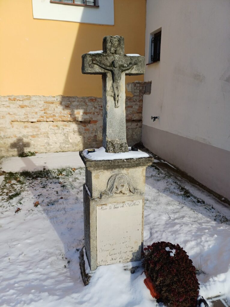 The Roman Catholic Church of St. Andrew the Apostle is a single-nave Romanesque structure with a horseshoe-shaped apse and an integrated tower, dating back to approximately the mid-13th century. It underwent Gothic modifications at the end of the 15th century, from which a Gothic pastophorium (tabernacle) has been preserved. In the 18th century, the church was renovated in the Baroque style, during which the tower and a sacristy were added. A second sacristy was added on the opposite side of the apse in the 19th century. The interior features a Romanesque stone baptismal font, a Gothic pastophorium with its original grille, and an epitaph of the estate owner Šárkány from 1565 located in the base of the tower. Among the architectural details, a tympanum with a cross motif and palmette ornament from the original Romanesque portal has survived. The church facades are divided by semi-circular windows with framed surrounds, featuring keystones in the nave. The tower with rounded corners is articulated by pilaster strips and topped with a crowning cornice with a clock disc and a bell-shaped helm with a lantern.