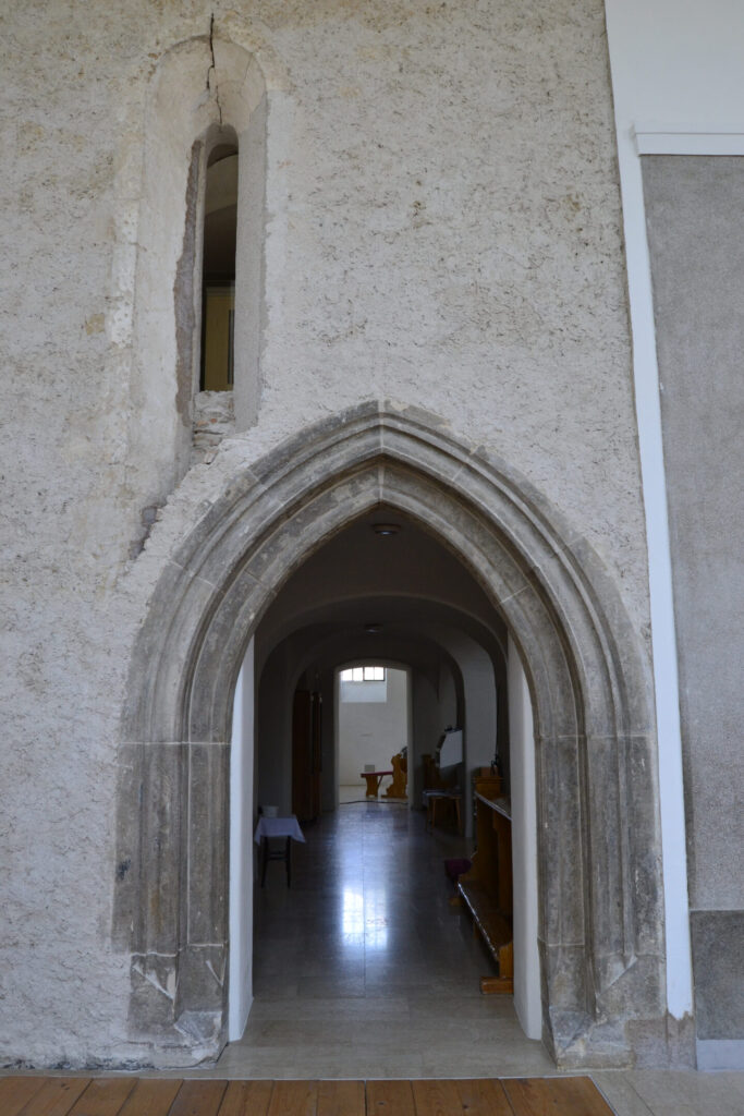 A templom 1221-ben épült, főként a pozsonyi kőfejtőkből származó tört kőből. Az épület korai gótikus stílusban készült, építészetileg a bencés plébániatemplomok mintáját követte. Egészen a 20. század első harmadáig megőrizte eredeti jellegét. A szentélyt keresztboltozat fedi, amely a sekrestyével együtt eredeti állapotában maradt fenn. A főhajót diadalív választja el a szentélytől. Az új, késő gótikus boltozat 1480-ban készült el, ám kivitelezése viszonylag hanyag. A szentély, a sekrestye és a torony a 13. századból származik, csakúgy, mint a főhajó fala és az oldalhajók falainak részei, amelyek 3-4 méteres magasságig pillérként maradtak meg; ezt az eredeti bordák töredékei is bizonyítják. A török támadások során az épület jelentősen megsérült: megsemmisült a gótikus berendezés és a toronyóra is.