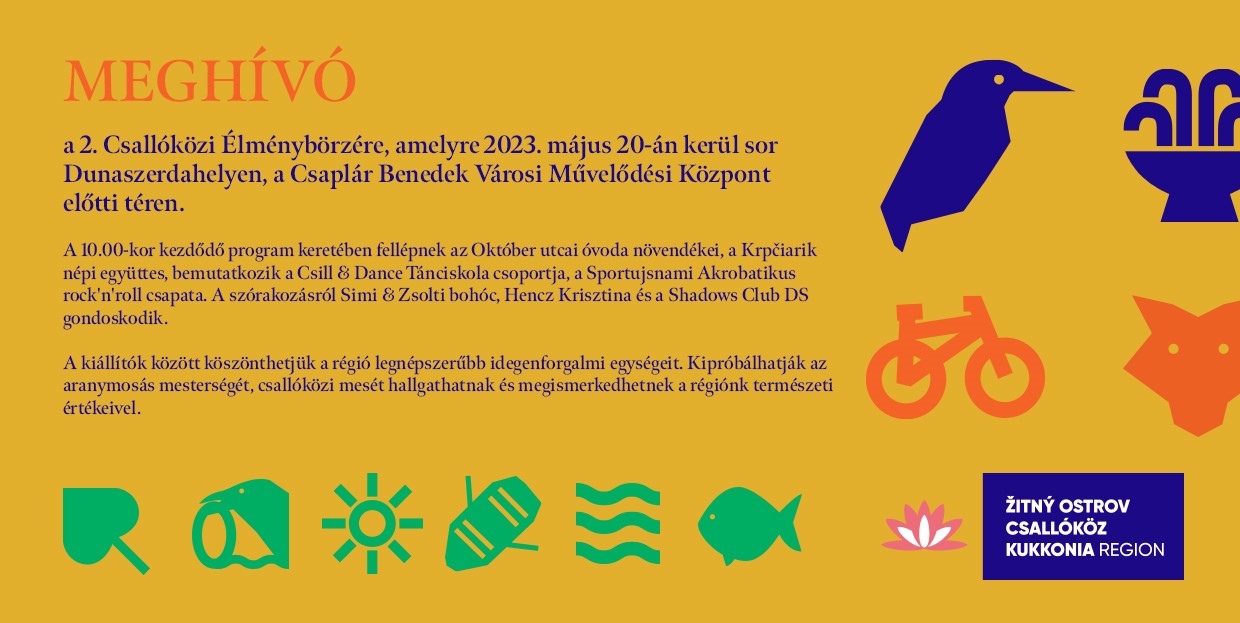 Találkozzunk a 2. Csallóközi Élménybörzén május 20-án, a Dunaszerdahelyi Csaplár Benedek Városi Művelődési Központ előtti téren! Csobbanás, száguldás, tánc, nagymacskák, alkotás, különleges pillanatok – ez mind a Csallóközben! Fedezd fel a lehetőségek szigetét, kóstolj bele az élményekbe és csodálkozz el azon, hogy mennyi látnivalót rejt a Csallóköz! Színes programokkal, bemutatókkal, előadásokkal, koncerttel és számos látnivalóval várunk! Részletes program a galériában.