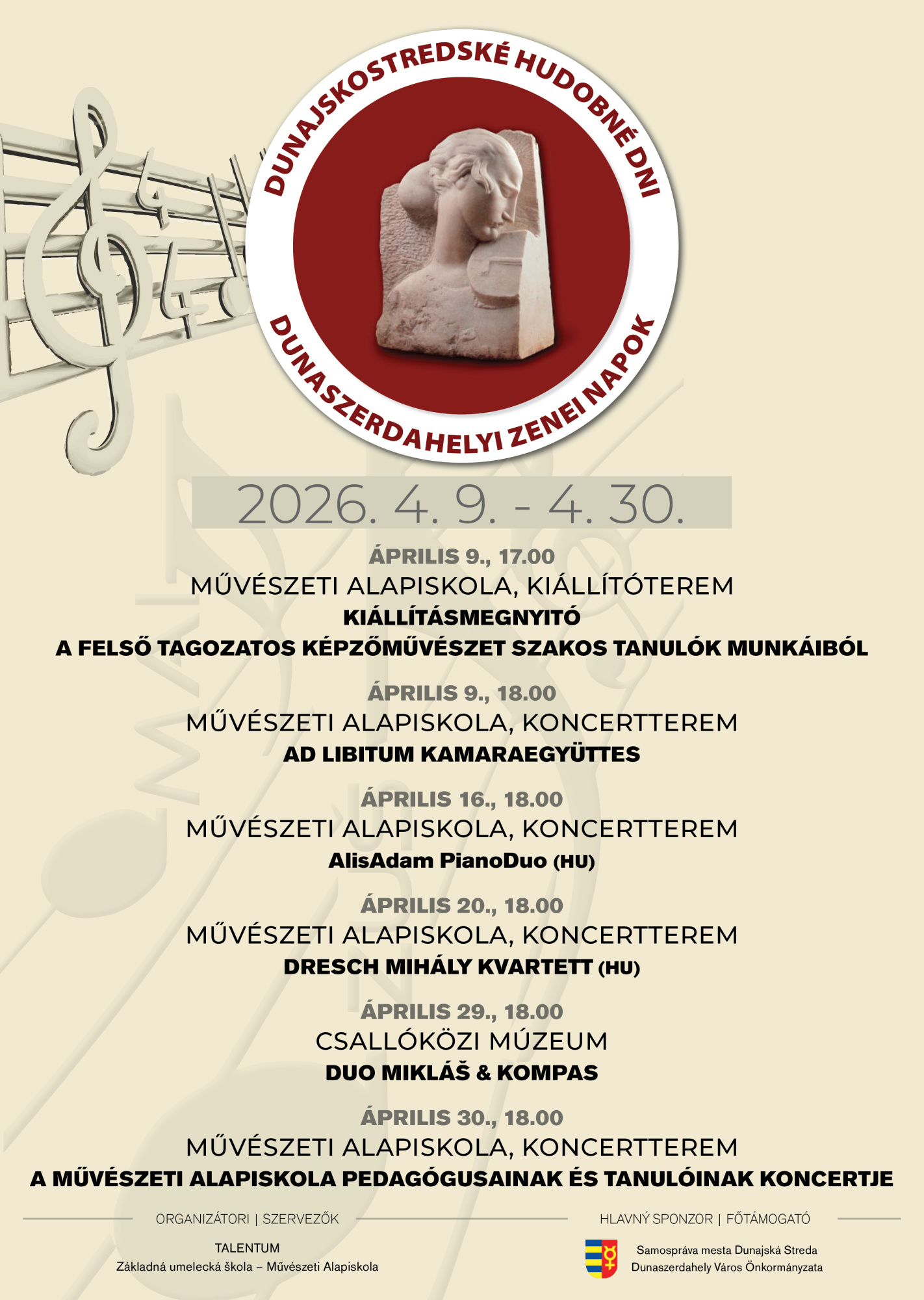 A zenei estek sora április 16-án folytatódik, amikor az AlisAdam PianoDuo (Magyarország) ad koncertet a Művészeti Alapiskola koncerttermében. Április 20-án szintén itt lép fel a Dresch Mihály kvartett, amely etnojazz-zel, azaz a jazz és a népzene különleges ötvözetével várja a közönséget.