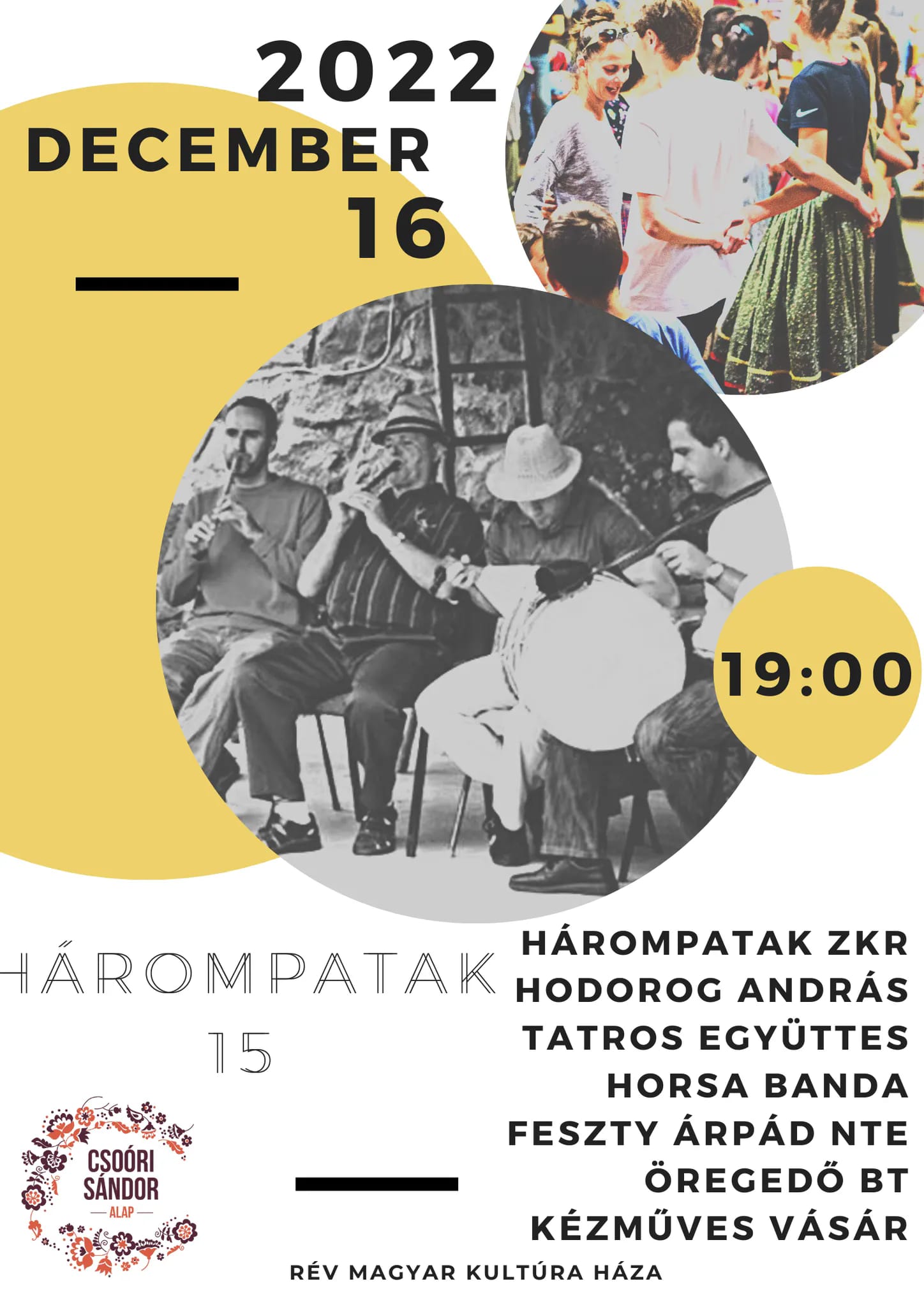 Fellépnek: a Hárompatak zenekar, a moldvai hangszeres tanfolyamok látogatói, Hodorog András Moldvából, a Tatros Együttes, a Horsa Banda, a Feszty Árpád Néptáncegyüttes, az Öregedő Bt Nyalkáról