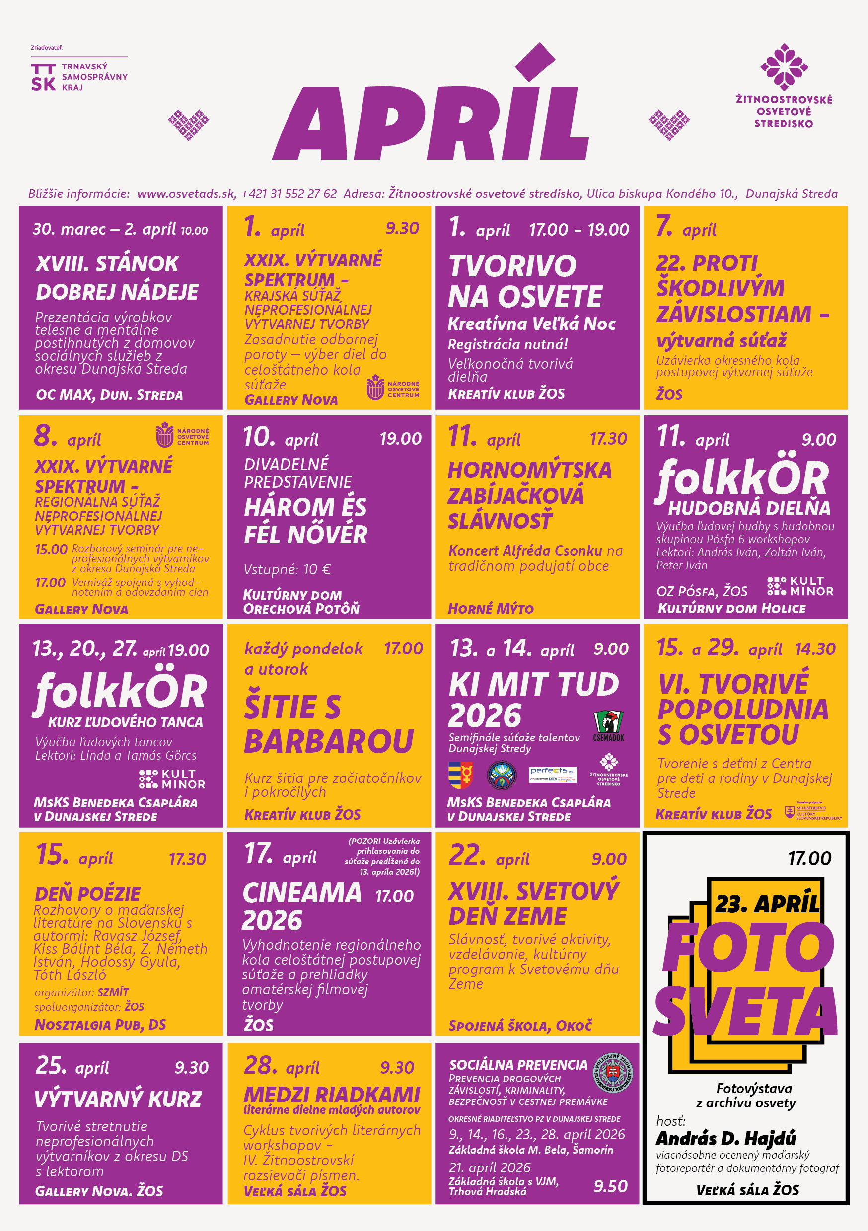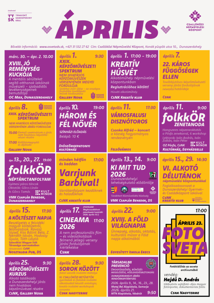 Csallóközi Népművelési Központ áprilisi programjai – részletek a galériában található plakáton.