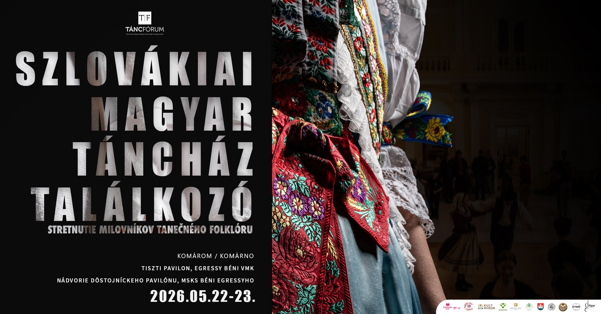 Nagy örömmel jelentjük be, hogy 2026-ban is megrendezésre kerül a Szlovákiai Magyar Táncháztalálkozó! Idén május 22–23-án várunk minden táncot, zenét és hagyományokat kedvelőt Komáromban! Ahogy azt már megszokhattátok, idén is színes programokkal készülünk: koncertek, előadások, tánctanítások, gyerekprogramok, beszélgetések és számos izgalmas élmény vár rátok a két nap során.