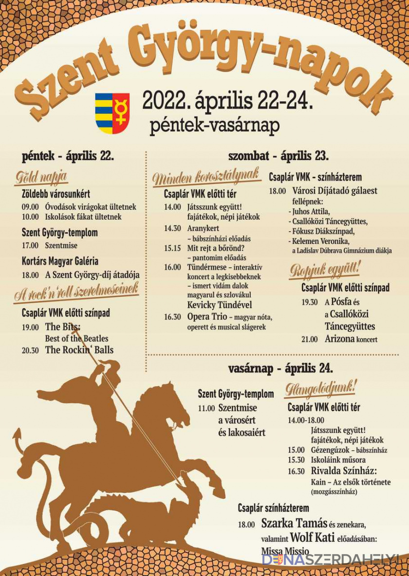 Idén április 22–24-e között gazdag programokkal várja az érdeklődőket a dunaszerdahelyi Szent György-napok – városunk alapításának, védőszentjének, egyesítésének és jeles személyiségeinek ünnepnapjai.