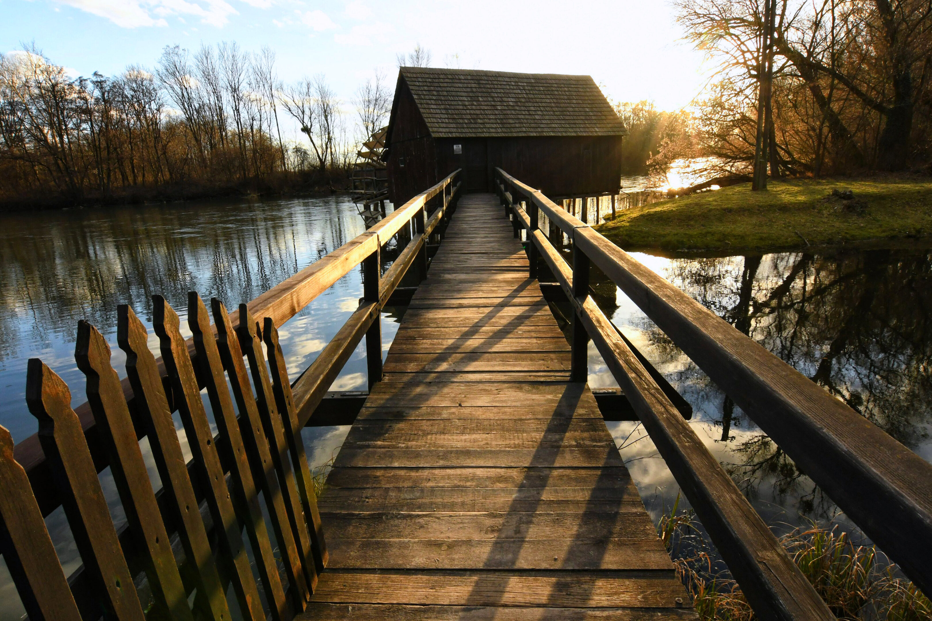 A technical cultural monument, the watermill in Dunajský Klátov, sits on the bank of the Klátov offshoot of the Little Danube, in the cadastral territory of the village of Dunajský Klátov, district of Dunajská Streda. It is a typical example of a watermill built on slow flowing water. The afflux is the only right tributary of the Little Danube. It rises from the ground and in a long stretch almost copies the flow of the river. Its waters are crystal clear, full of fish and shells, with the highest degree of nature protection. It is reachable to the swimming pool Topolniky only, other parts of river for permission only and in time outside the