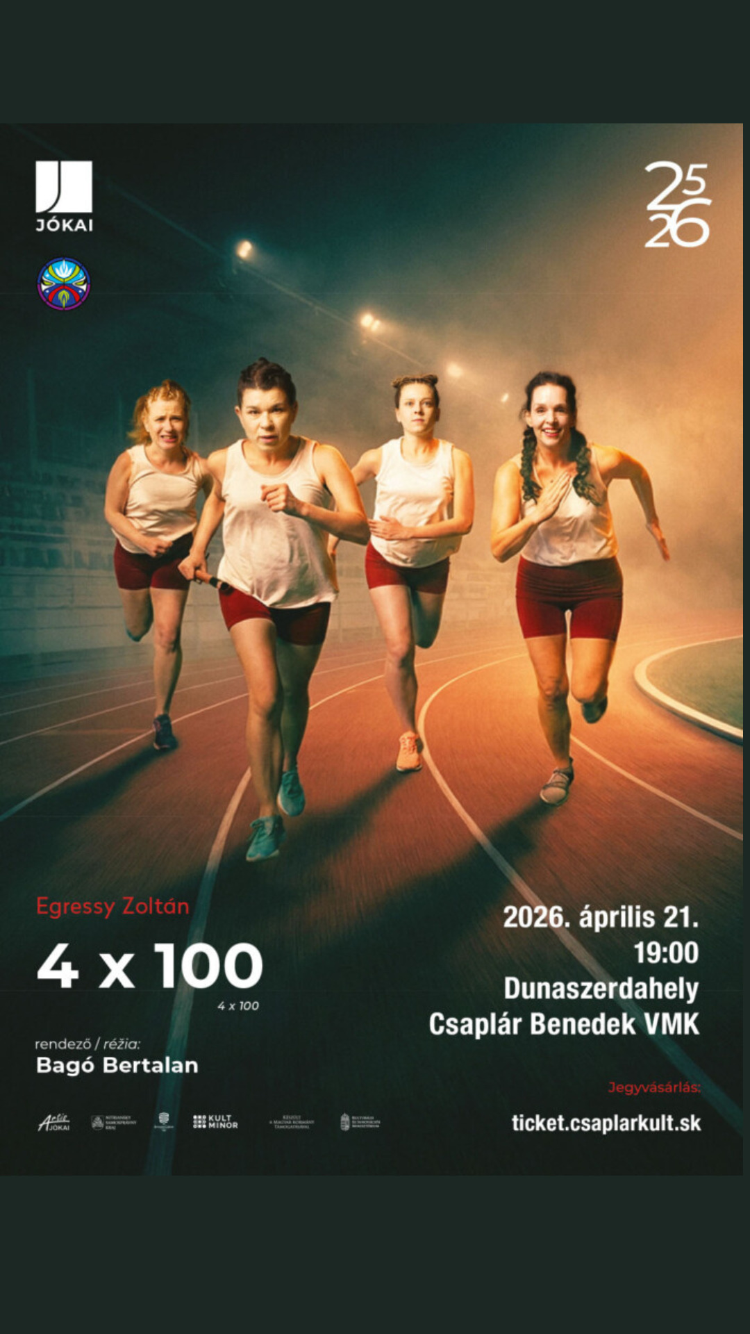 Divadelná hra Zoltána Egressyho je síce o športovkyniach, ale nie o športe v prvom rade. Dnešná tragikomédia sa odohráva v Budapešti v masérskej miestnosti, respektíve na atletickej dráhe štadióna počas rozcvičky. Okrem štyroch šprintérok (Praclík, Grafika, Snežienka a Maláeszter) sa v hre objavia dve postavy: čarovný masér Dali a trénerka pani Džudi. Ženský štafetový tím na 4×100 metrov sa chystá na dosiahnutie olympijskej úrovne. Šance súdržnosti zhoršujú konflikty v profesionálnom aj súkromnom živote bežkýň. Na súťaži totiž musia ukázať doteraz najlepší výkon ich života na to, aby sa splnil vytúžený cieľ – zúčastniť sa olympijských hier. Situáciu skomplikuje, že nie pre každú členku tímu je rovnako dôležité „spojiť sa“. Zabliknú fragmenty ľudských osudov, tragické i tragikomické príbehy. Čas zviera postavy zvonka aj zvnútra. Udalosti rýchlo nasledujú po sebe, radosti aj smútky. Dievčatá uprostred prerušených myšlienok a zranených emócií bojujú za olympijskú účasť aj za šťastie.