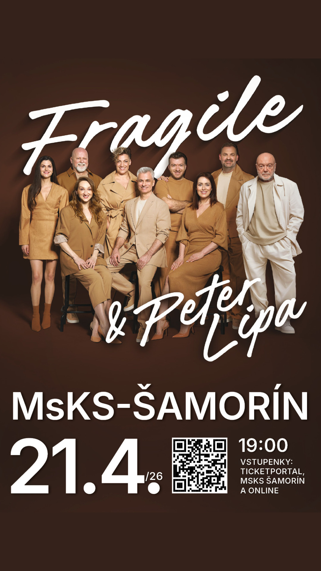 FRAGILE je slovenská vokálna skupina zložená z výrazných speváckych osobností, ktoré bez použitia hudobných nástrojov, teda a cappella, interpretujú známe svetové hity. Koncerty skupiny FRAGILE sú plné nielen výbornej hudby, ale aj podmanivého humoru, vďaka čomu zažijete neopakovateľný večer plný skvelej zábavy.