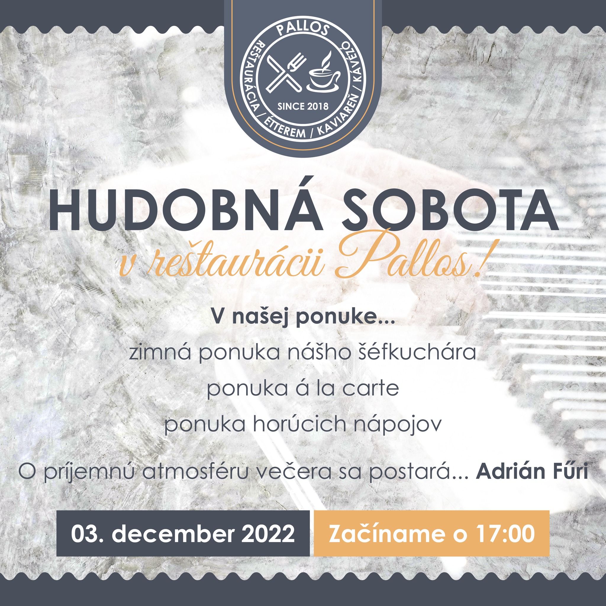Užite si prvú sobotu v decembri v reštaurácii Pallos (v Topoľníkoch), kde okrem ponuky horúcich nápojov a jedál a la carte si môžete pochutnávať už aj na najnovších špecialitách zimnej ponuky nášho Šéfkuchára. O dobrú náladu sa postarajú už dobre známe melódie Adriána Fűriho. Nenechajte si to ujsť, zarezervujte si Váš stôl telefonicky na čísle 0918 710 733!