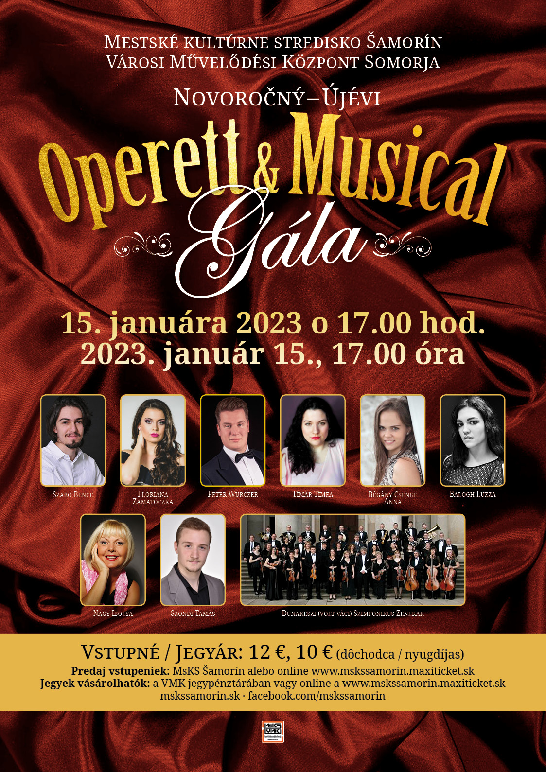 Pozývame Vás na jedinečný IV. Novoročný koncert plný nádherných operetných a musicalových skladieb. Spievajú ocenení mladí sólisti súťaže „Elizabeth Házy Medzinárodná spevácka talentová súťaž“. Cena vstupenky: 12,00 €. Dôchodcom: 10,00 € (dôchodcovia si môžu zľavnený lístok zakúpiť v MsKS Šamorín)