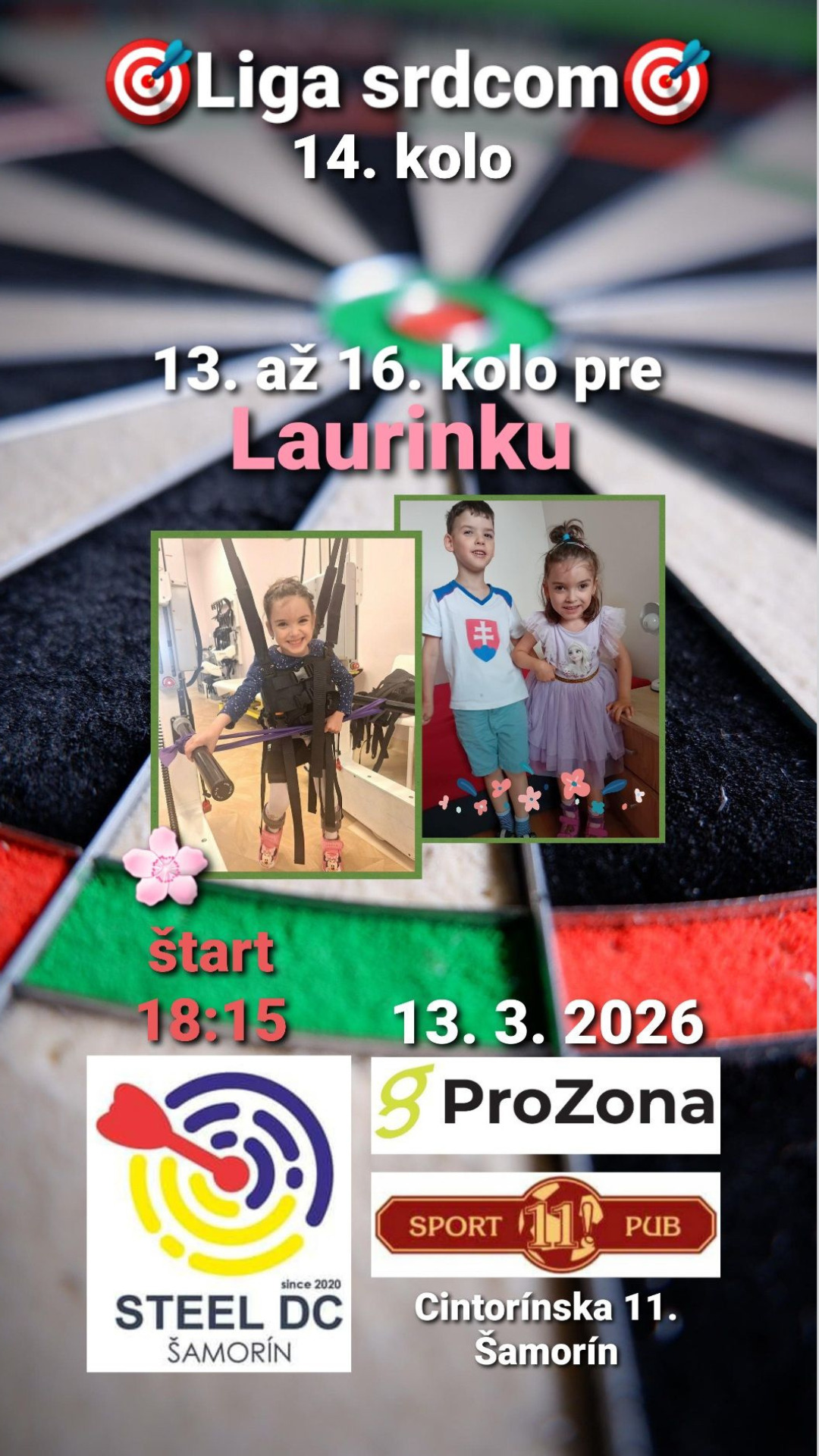 Pozývame vás na 14. kolo našej darts ligy. Toto kolo, ako aj nasledujúce 15. a 16., venujeme Laurinke Csicsayovej, dcérke nášho kamaráta Patrika. Príďte si zahrať šípky, zabaviť sa a podporiť Laurinku. Spojme príjemné s užitočným. Tešíme sa na vás!