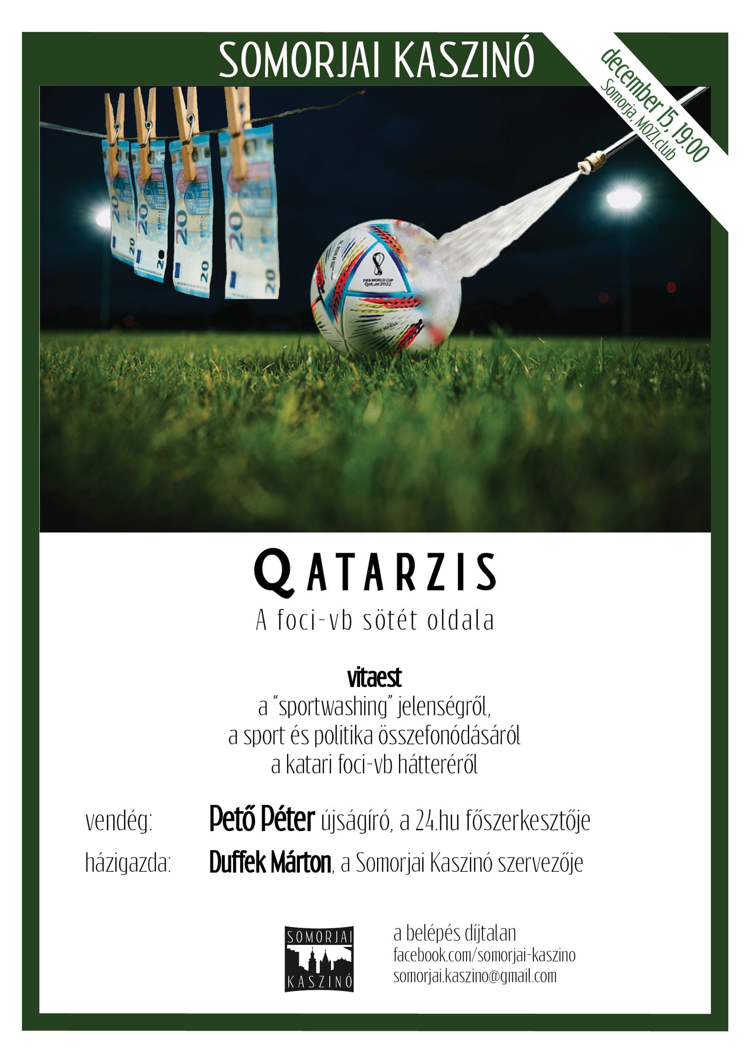 Najdrahšie – a najkontroverznejšie – majstrovstvá sveta vo futbale všetkých čias sú tohtoročné majstrovstvá v Katare. O tejto téme hovoria v maďarskom jazyku 15. decembra 2022 v Šamoríne v klube Mozi.