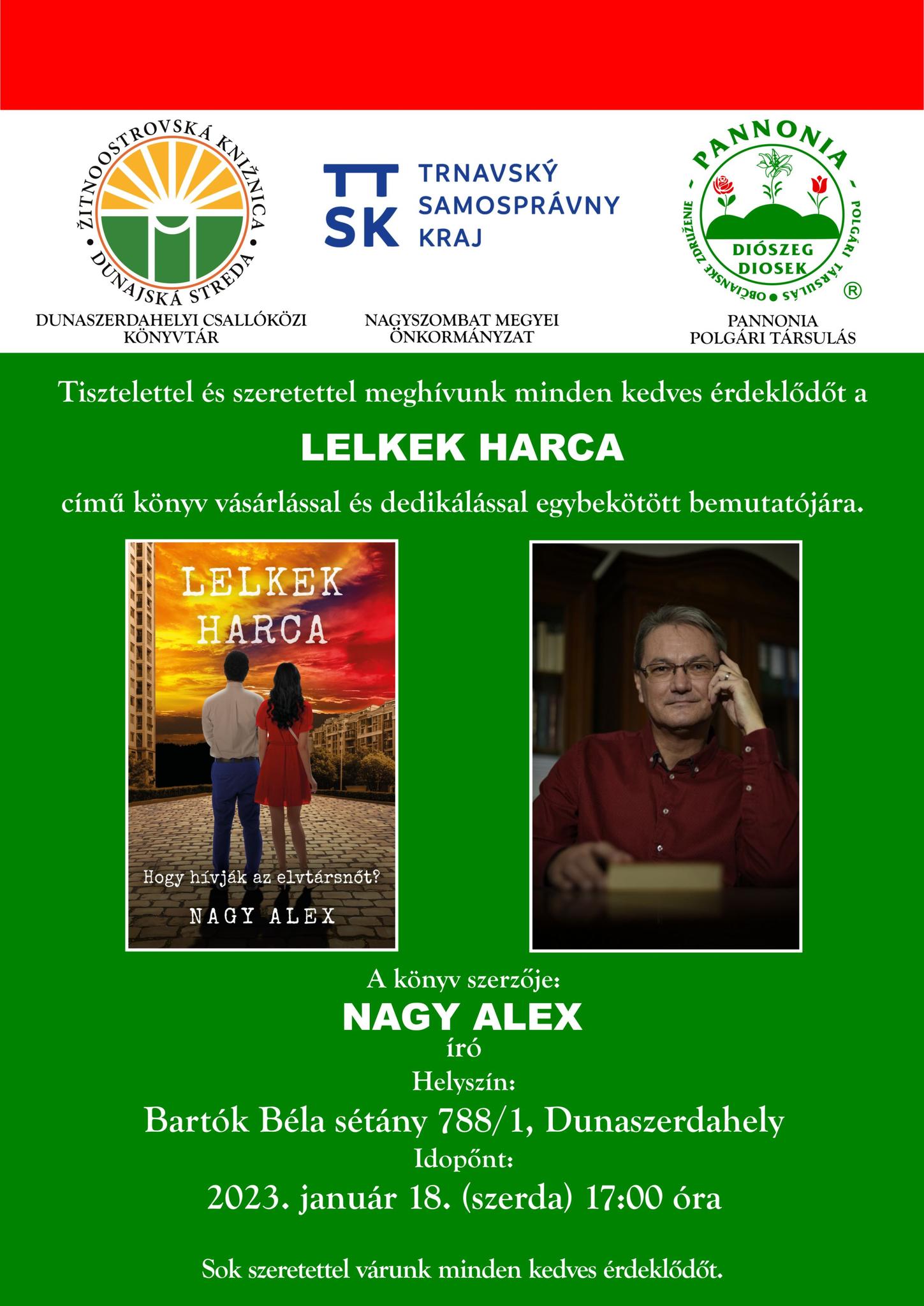 Prezentácia knihy Nagy Alexa „Lelkek harca (Súboj duší)“ bude v čitárni knižnice 18. januára 2023 o 17.00 hod. Podujatie prebieha v maďarskom jazyku.