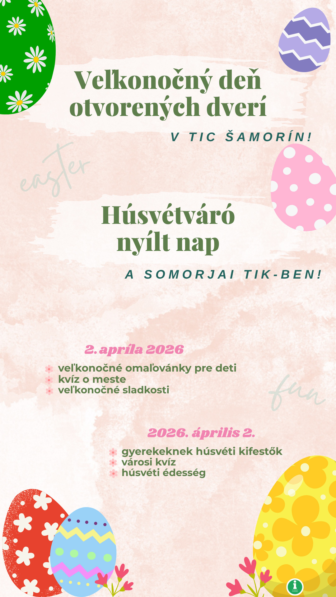Srdečne pozývame malých aj veľkých do nášho šamorínskeho centra, kde na vás čakajú: veľkonočné omaľovánky, kvíz o meste, veľkonočné sladkosti.