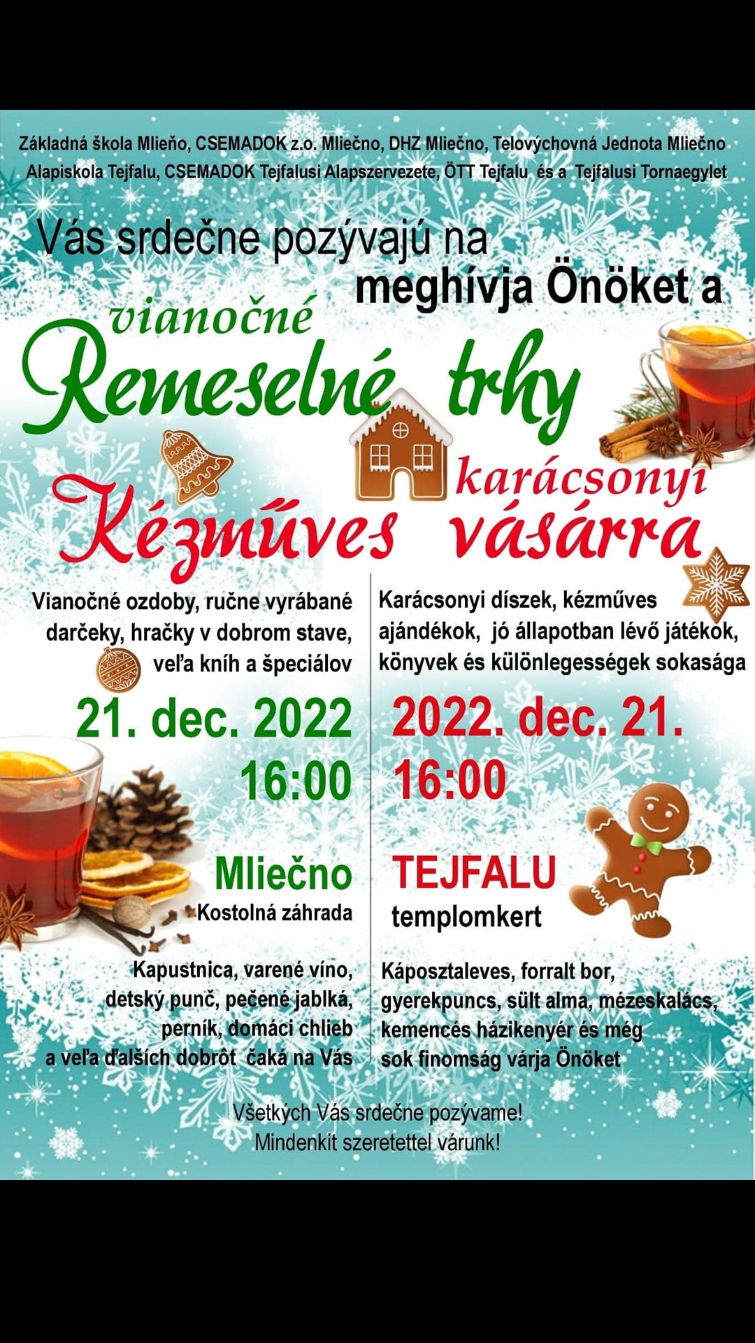 Srdečne vás pozývajú na „Vianočné remeselné trhy“ do Mliečna, ktoré budú 21. decembra 2022 od 16:00 v kostolnej záhrade. Podrobný program nájdete na plagáte v galérii.