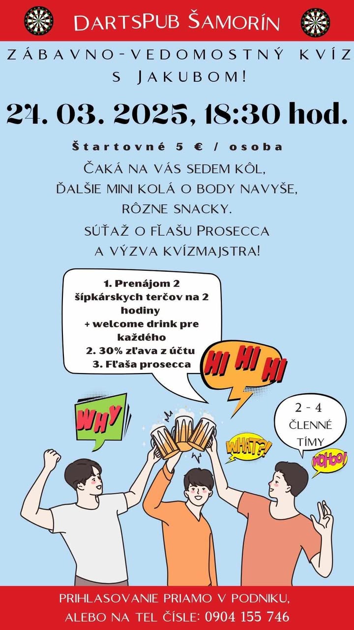 Prídite sa zabaviť na zábavno-vedomostný kvíz dňa 24.3.2025 v Darts Pub Šamorín /Bratislavská 33, Šamorín/.