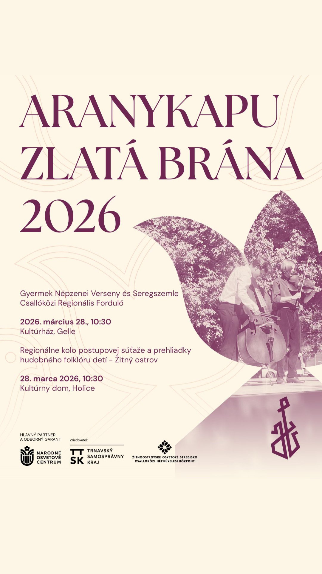 V sobotu 28. marca od 10:30 sa v kultúrnom dome v Holiciach uskutoční žitnoostrovské regionálne kolo celoštátnej súťaže hudobného folklóru detí Zlatá brána – Aranykapu. Počas dopoludnia si budete môcť pozrieť a vypočuť 7 súťažných vystúpení. Súťažiacich bude hodnotiť trojčlenná odborná porota v zložení Éva Korpás, Ildikó Varsányi a Iván Nagy.